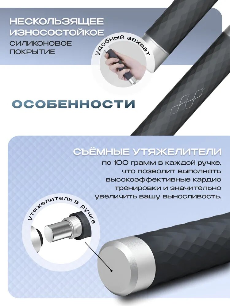 | Особенности | регулировка веса / регулировка длины / утяжелители в комплекте / утяжелённая / шнур на подшипнике / эргономичные рукоятки |