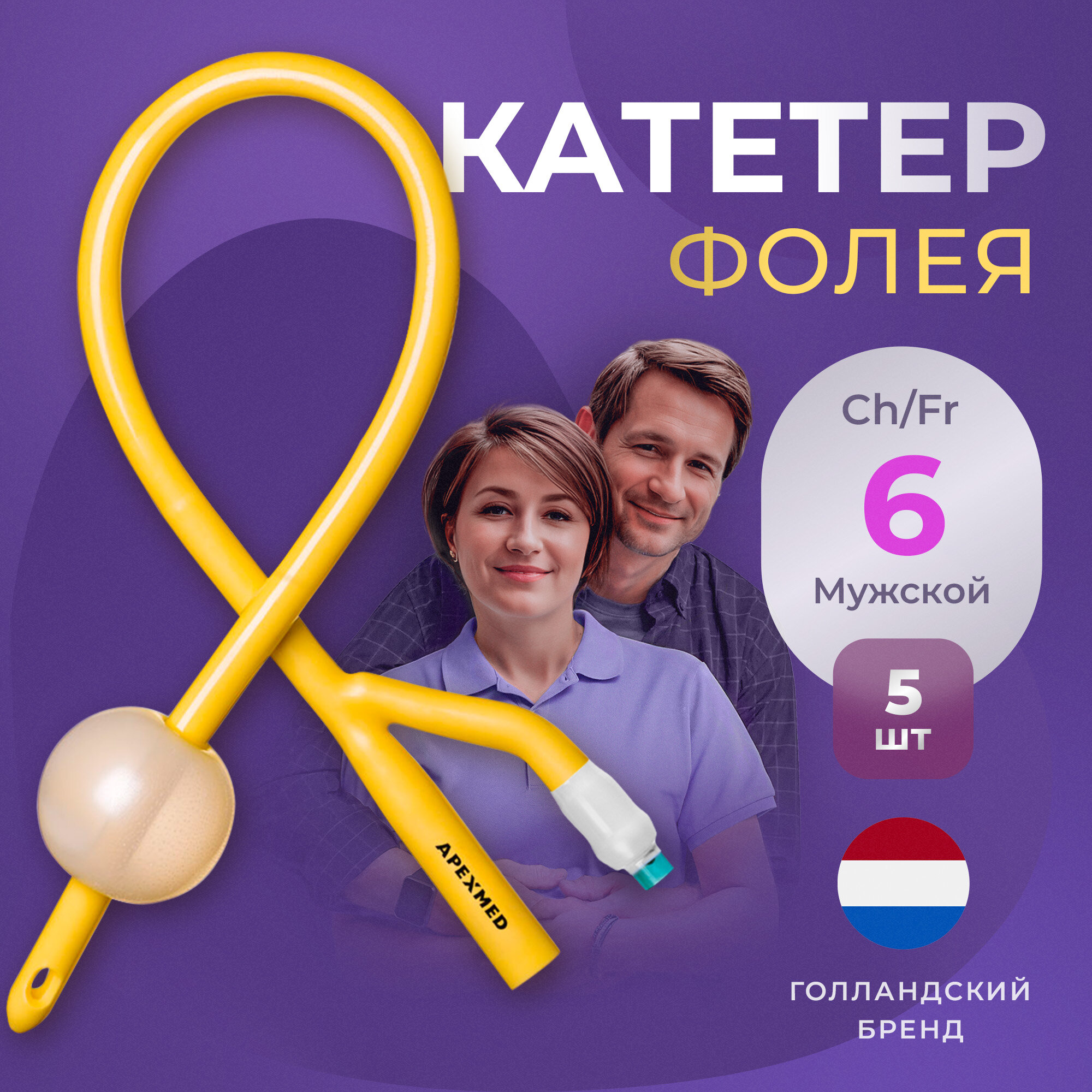 APEXMED Катетер Фолея урологический универсальный, мужской, Ch/Fr 6, двухходовой, 10 шт, уретральный, детский