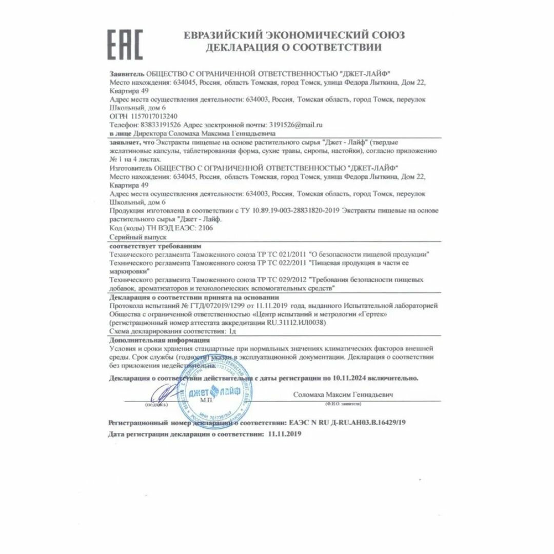 | Состав | сухие растительные экстракты спирулины и хлореллы; твердая желатиновая капсула |