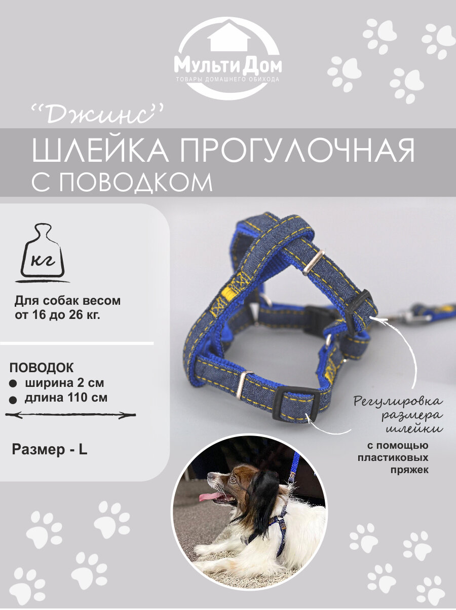 Шлейка прогулочная с поводком "Джинс", размер L, ширина 2 см, длинна 110 см.
