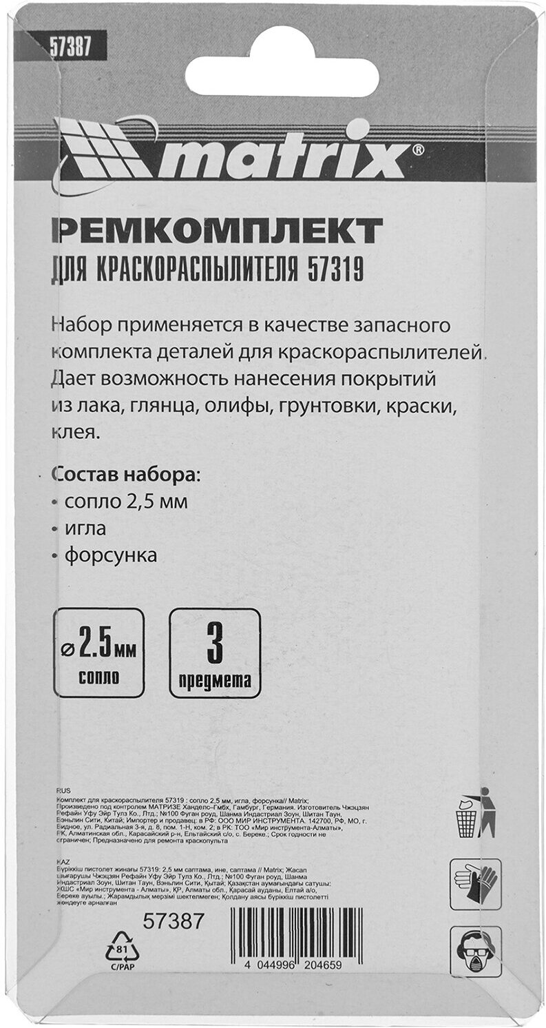 Комплект для краскораспылителя 57319 : сопло 2,5 мм, игла, форсунка// Matrix, 57387