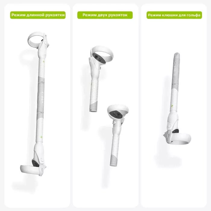 | Совместимость | AudioTrip / Eleven Table Tennis / FitXR / Fruit Ninja / Ragnarock / Smash Drums. Режим клюшки для гольфа - Golf+ / Supernatural VR / Walkabout Mini Golf / exVRience GOLF CLUB. Режим длинной рукоятки - Kayak VR: Mirage / Совместимые игры: Режим двух рукояток - BeatSaber / игры с использованием меча |