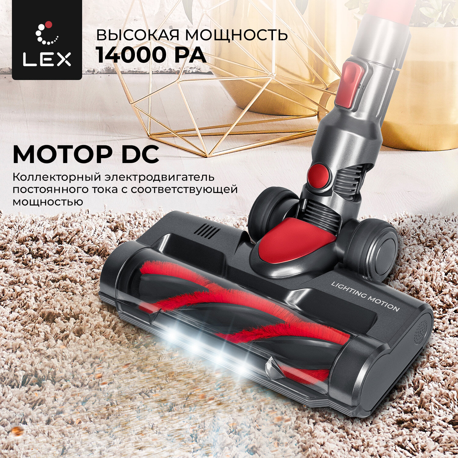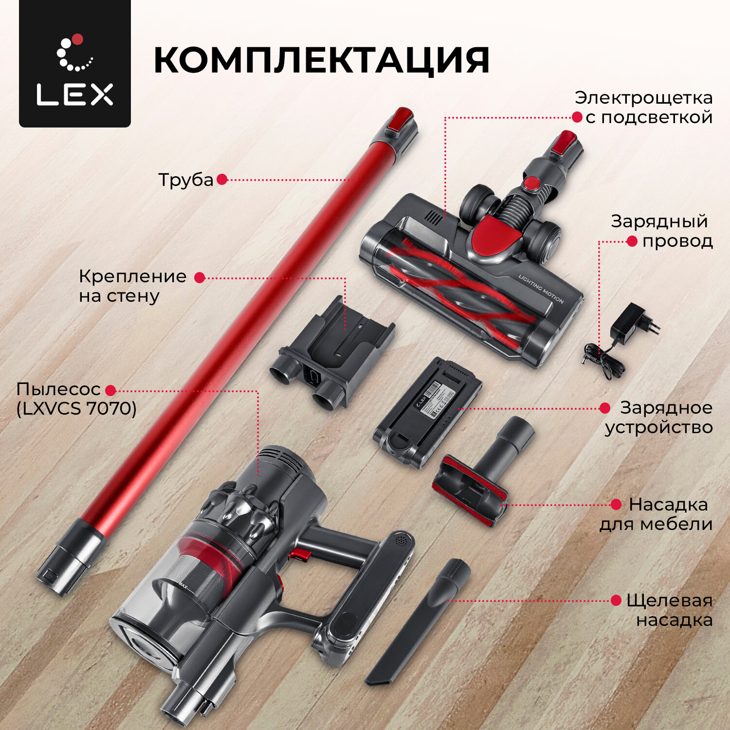 Пылесос беспроводной вертикальный LEX LXVCS 7070, для сухой уборки, 2 скорости, подсветка зоны уборки, емкость аккумулятора, 2200 мАч, 3 насадки, цвет-неповторимый рубиновый. интересное: