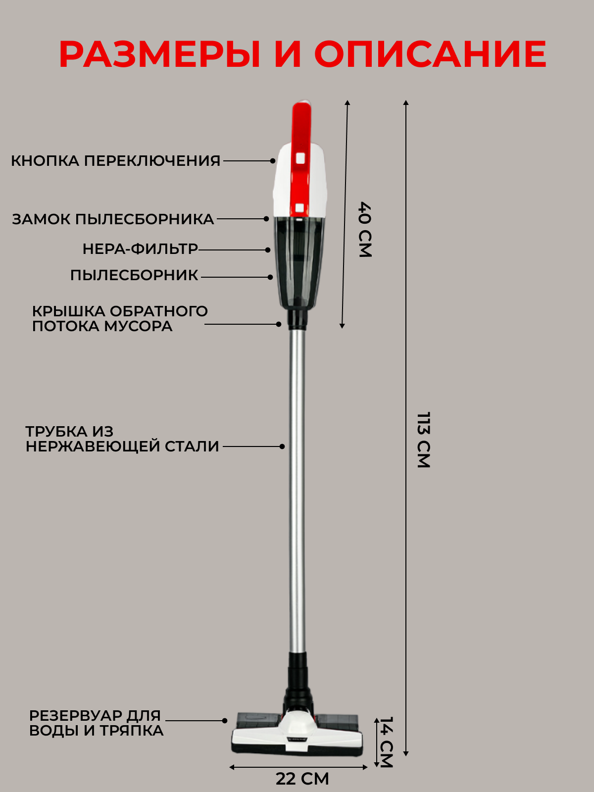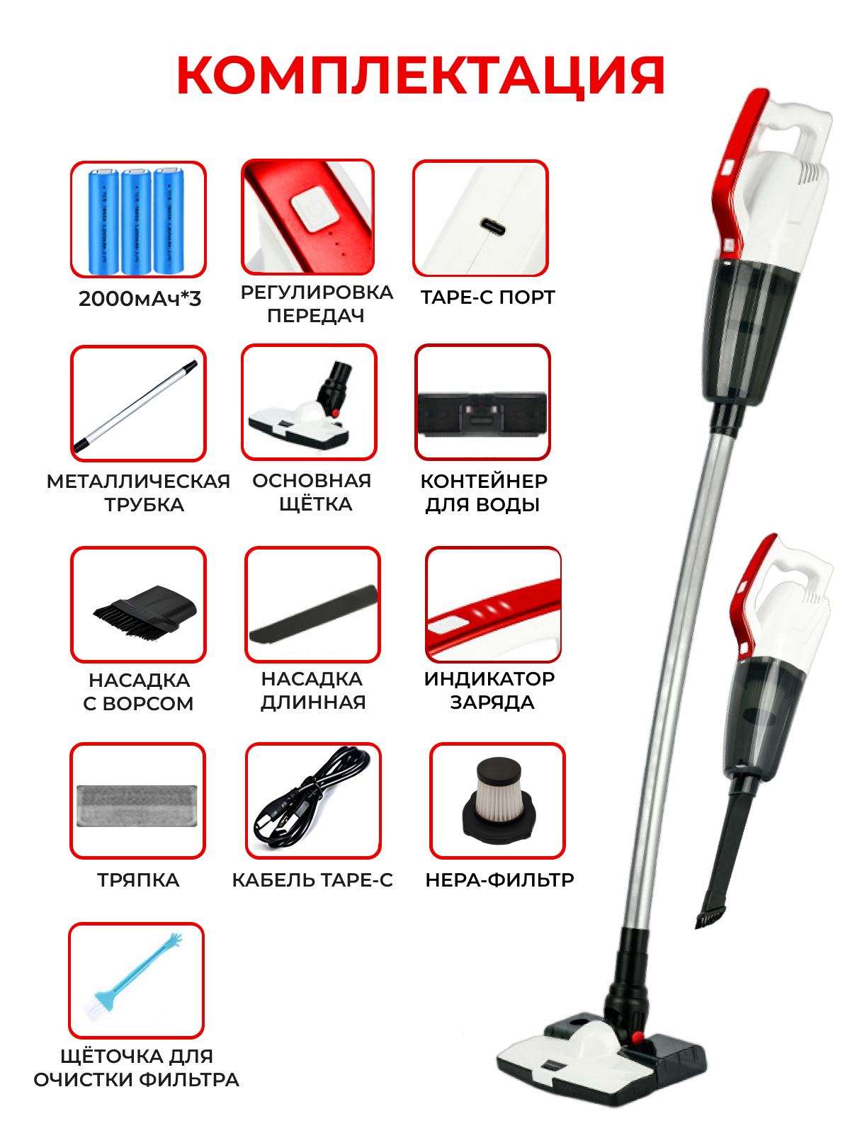 | В комплекте | адаптер для уборки труднодоступных мест, зарядное устройство, крепление для дополнительных насадок на трубу, насадка для автомобиля, насадка для клавиатуры, насадка для ламината и паркета, насадка для мягкой мебели, насадка для твердых покрытий мебели, насадка для удаления шерсти, насадка для штор, насадка с мягкой щетиной, настенный держатель, универсальная насадка для влажной уборки, универсальная насадка для сухой уборки, щеточка для очистки |