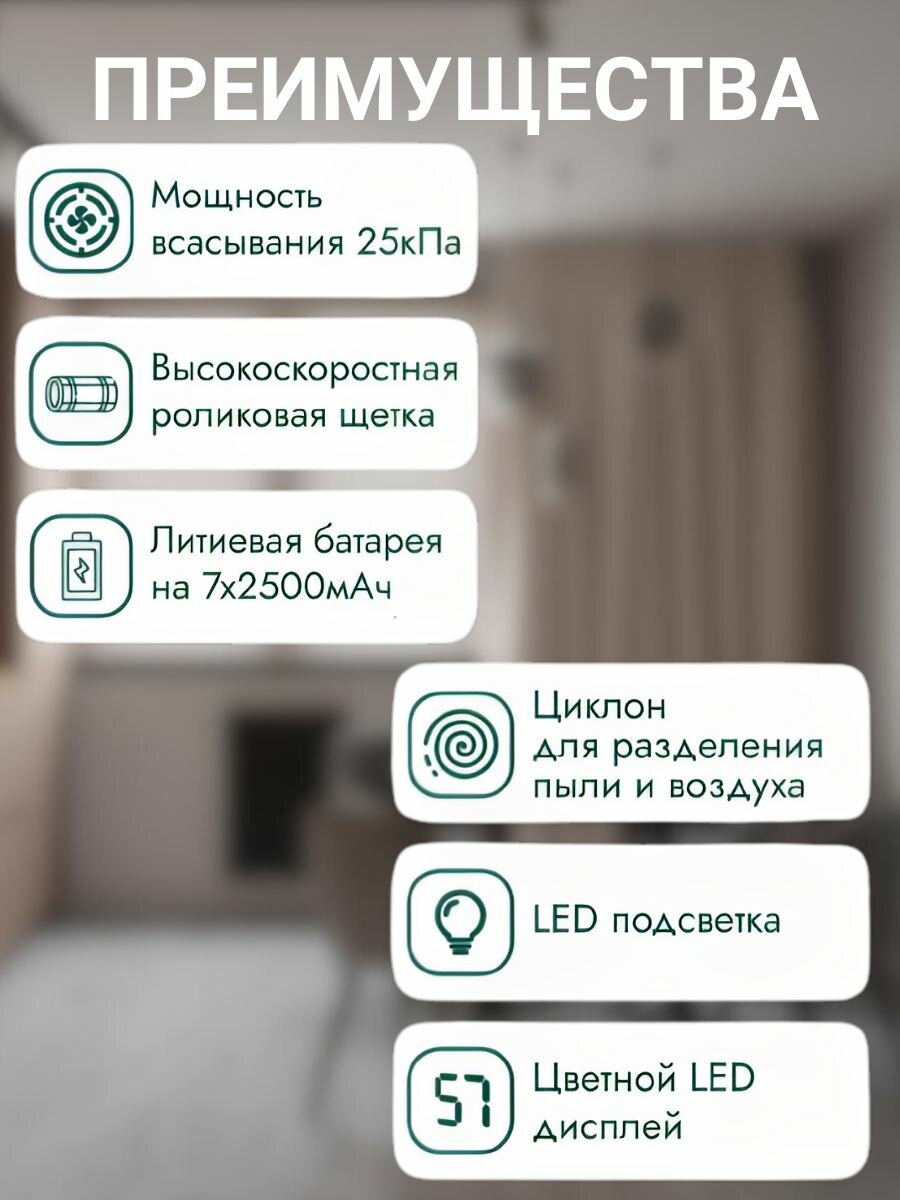 | Дополнительная информация | Светодиодный дисплей, циклонный фильтр, высокоскоростная роликовая щетка |