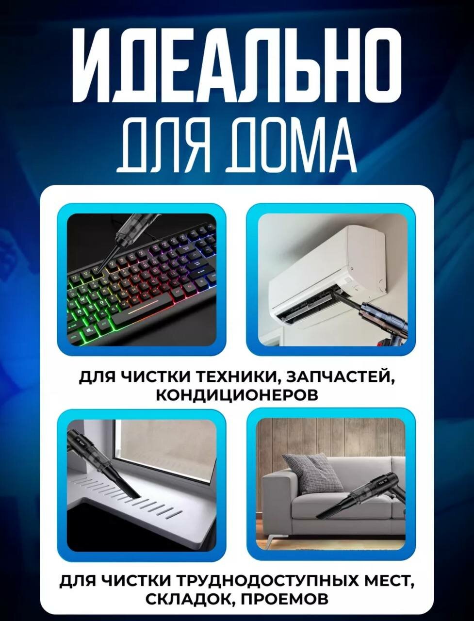 | В комплекте | зарядное устройство, насадка для автомобиля, насадка для клавиатуры, насадка для мягкой мебели, переходник-адаптер |