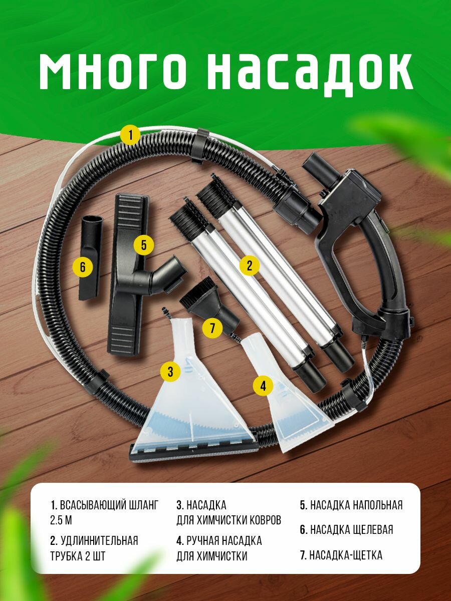 | В комплекте | дополнительный резервуар для воды, насадка для автомобиля, насадка для сбора жидкости, насадка для твердых покрытий мебели, распылитель для мебели, распылитель для чистки ковров, универсальная насадка для влажной уборки, универсальная насадка для сухой уборки |