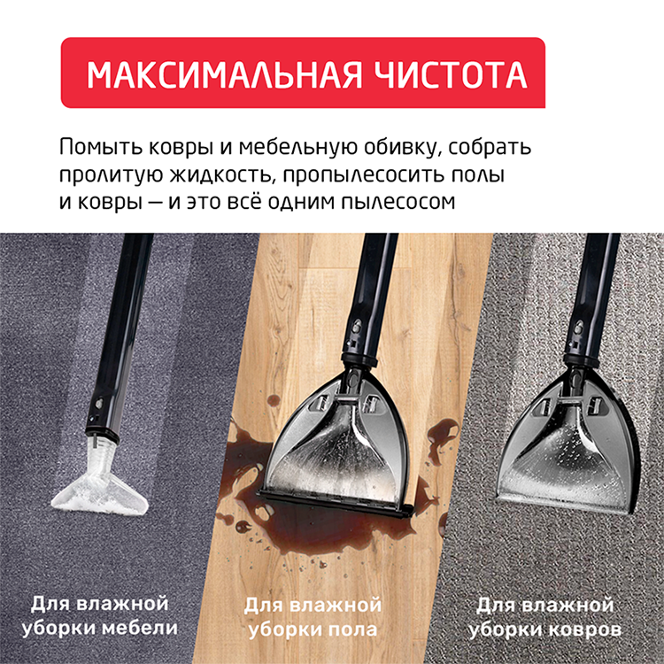| Дополнительная информация | возможность всасывания пролитых жидкостей; функция подачи шампуня; объем воды в баке в режиме сухой чистки через аквафильтр 2 л; объем всасываемой жидкости до 8 л; защита от влажности IPX4; радиус действия 8.3 м; выходной фильтр HEPA H13; резервуар для моющего средства 4.5 л |