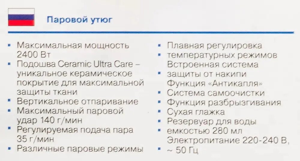 | Дополнительные функции | паровой удар / система самоочистки / сухая глажка / функция разбрызгивания |