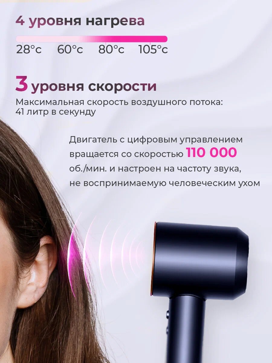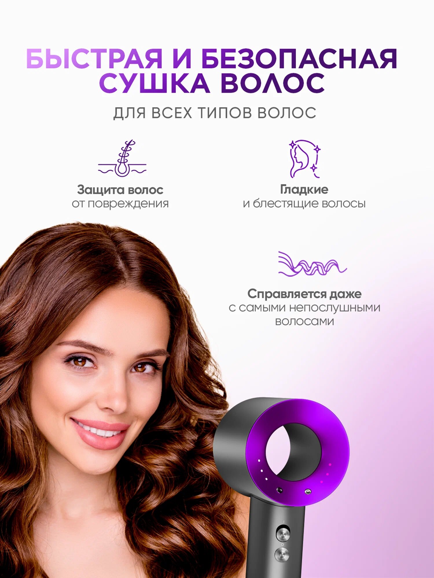 Купить Профессиональный фен для волос 1600 Вт, 3 режима, 1 магнитная насадка, ионизация воздуха, фиолетовый