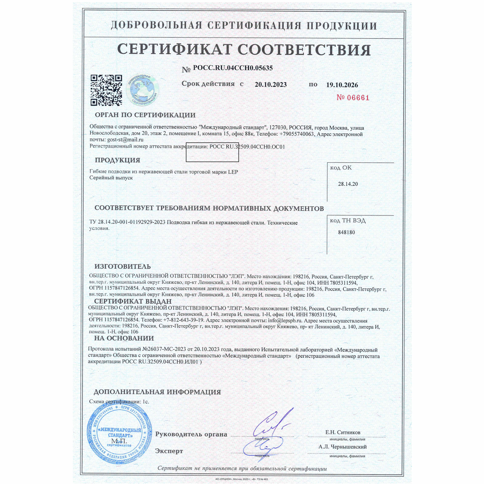 | Дополнительная информация | Гибкая подводка для воды и отопления из нержавеющей стали SS304 с толщиной стенки 0,3мм |