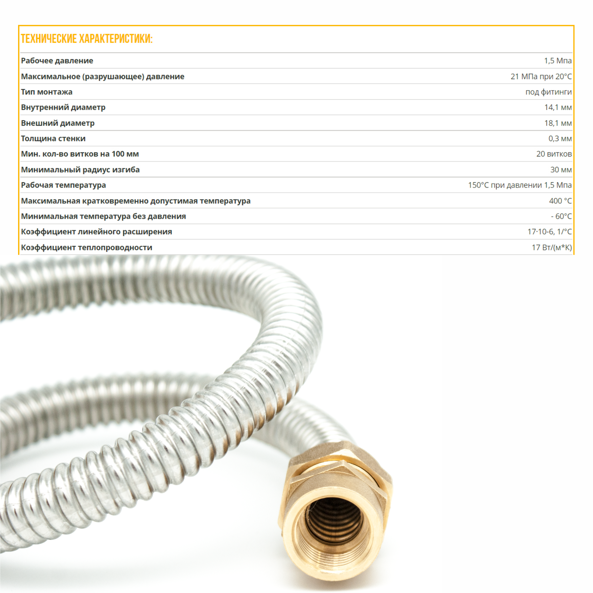 | Дополнительная информация | Гибкая подводка для воды и отопления из нержавеющей стали SS304 с толщиной стенки 0,3мм |