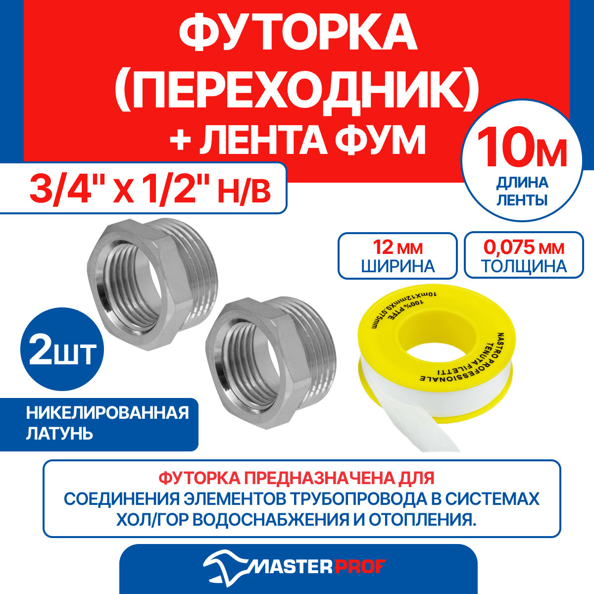 Купить Футорка (переходник) 3/4" х 1/2" н/в MPF, 2 шт + лента ФУМ 10 м