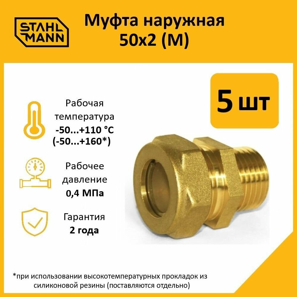 Комплект муфт соединительных для водопроводных труб Stahlmann М 50х2 EF, цвет желтый, 5 шт.