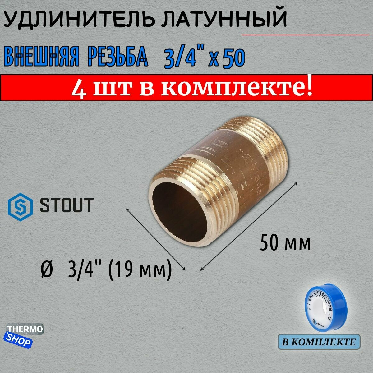 Купить Удлинитель НН 3/4"x50 4 шт сантехнический для труб ФУМ лента