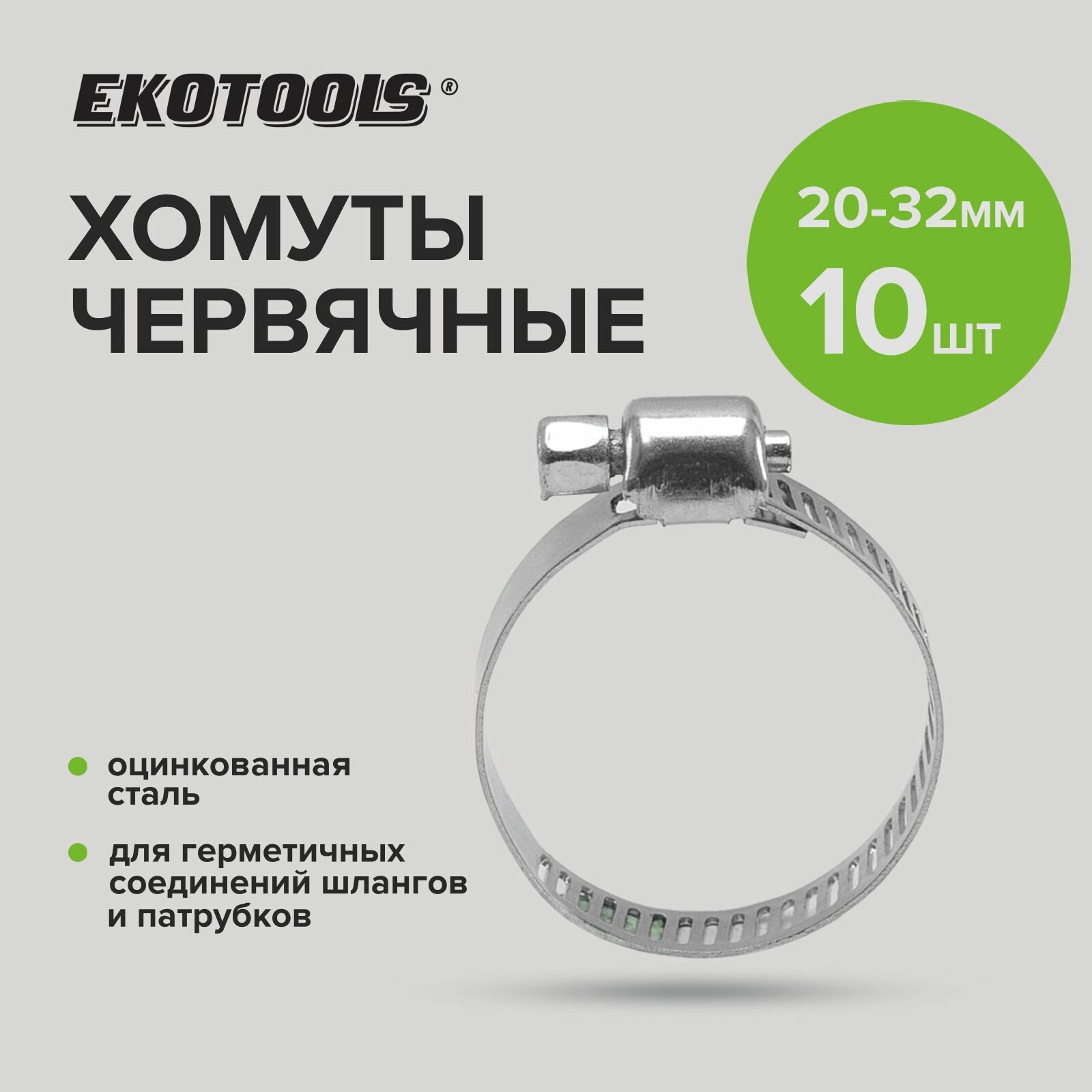 Червячные хомуты EKOTOOLS просечные, оцинкованные, 10 шт. в упаковке, 20 мм-32 мм 3202220