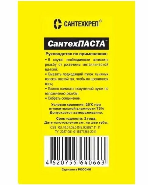 | Дополнительная информация | Условия хранения пасты "Сантехпаста" составляют 25°C |