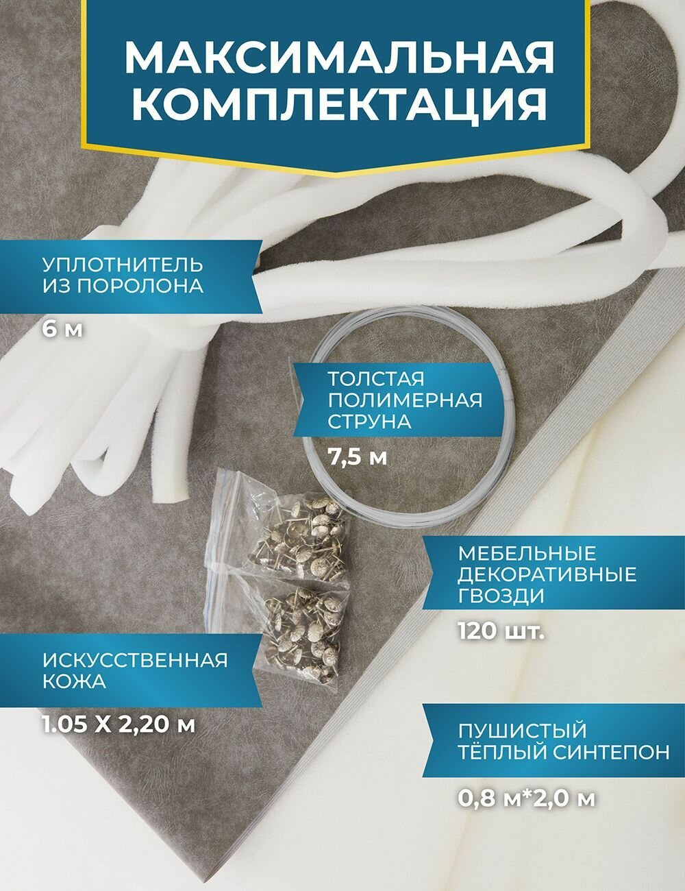 | Комплектация | Искусственная кожа 1.05 Х 2,20 м Пушистый теплый синтепон 0,8 м х 2,0 м Поролоновый уплотнитель 6 м Мебельные декоративные гвозди 120 шт. Толстая полимерная струна 7,5 м |