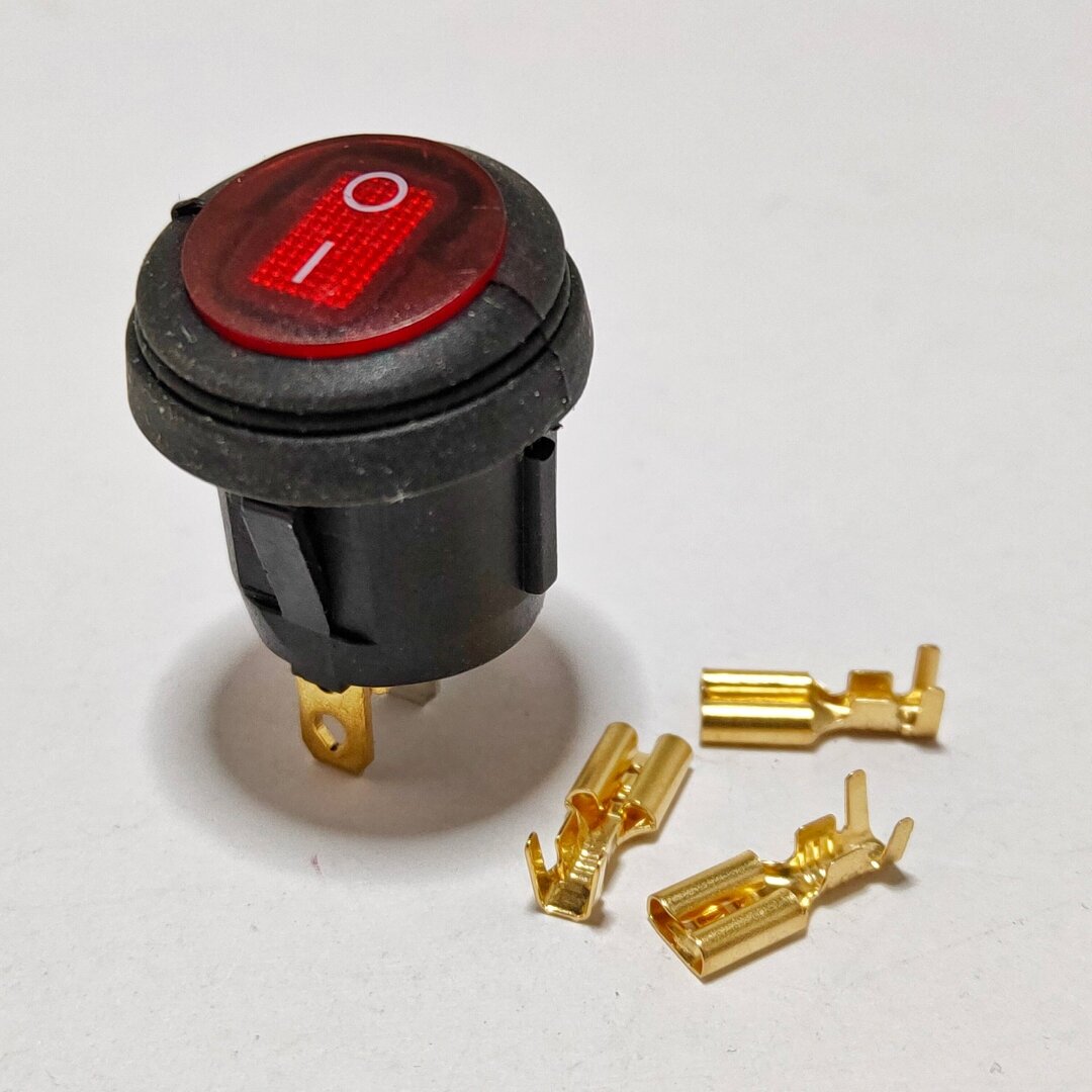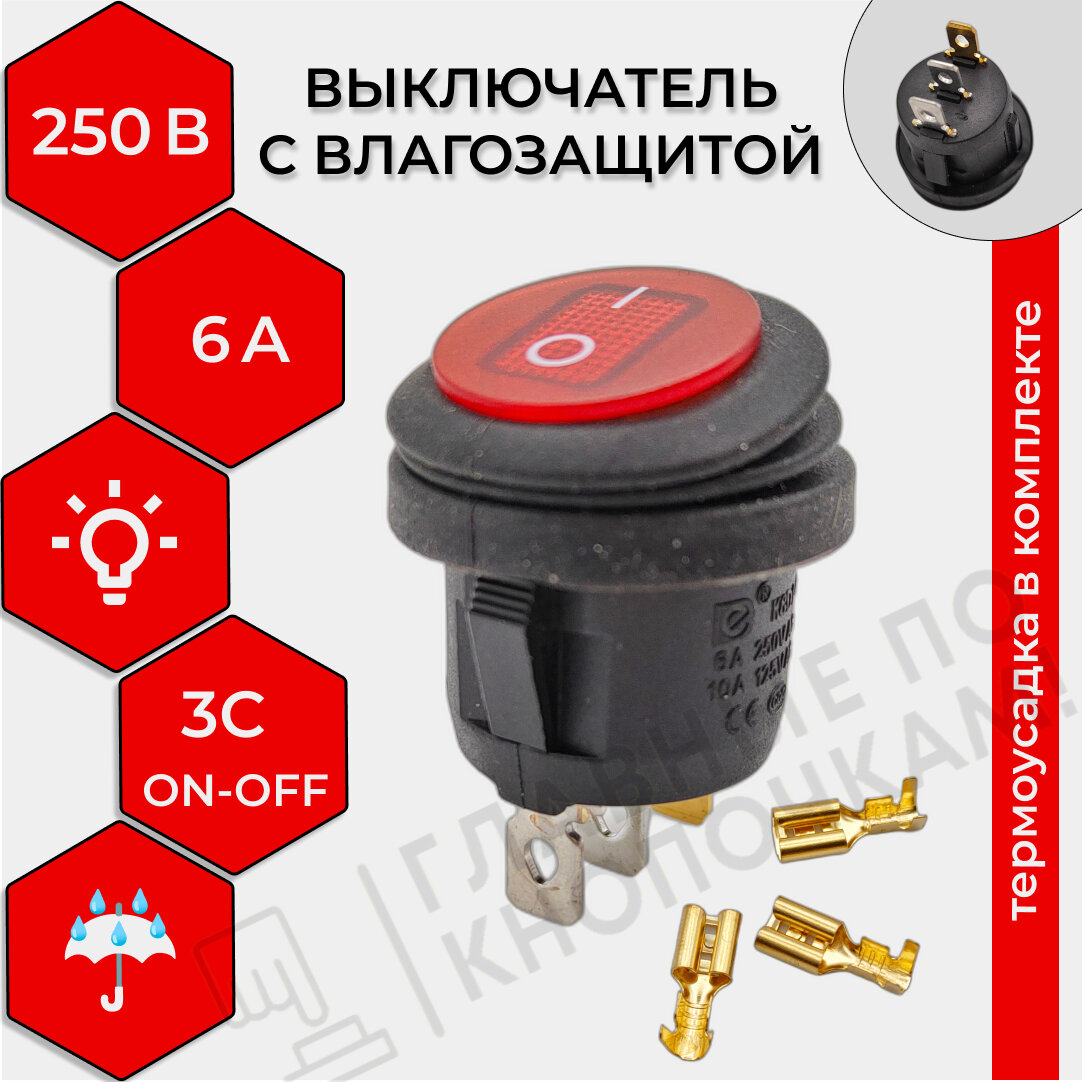 СохранитьВыключатель клавишный круглый влагозащита подсветка 250V 6А (3с) ON-OFF красный (комплект с клеммами и термоусадкой) интересное: