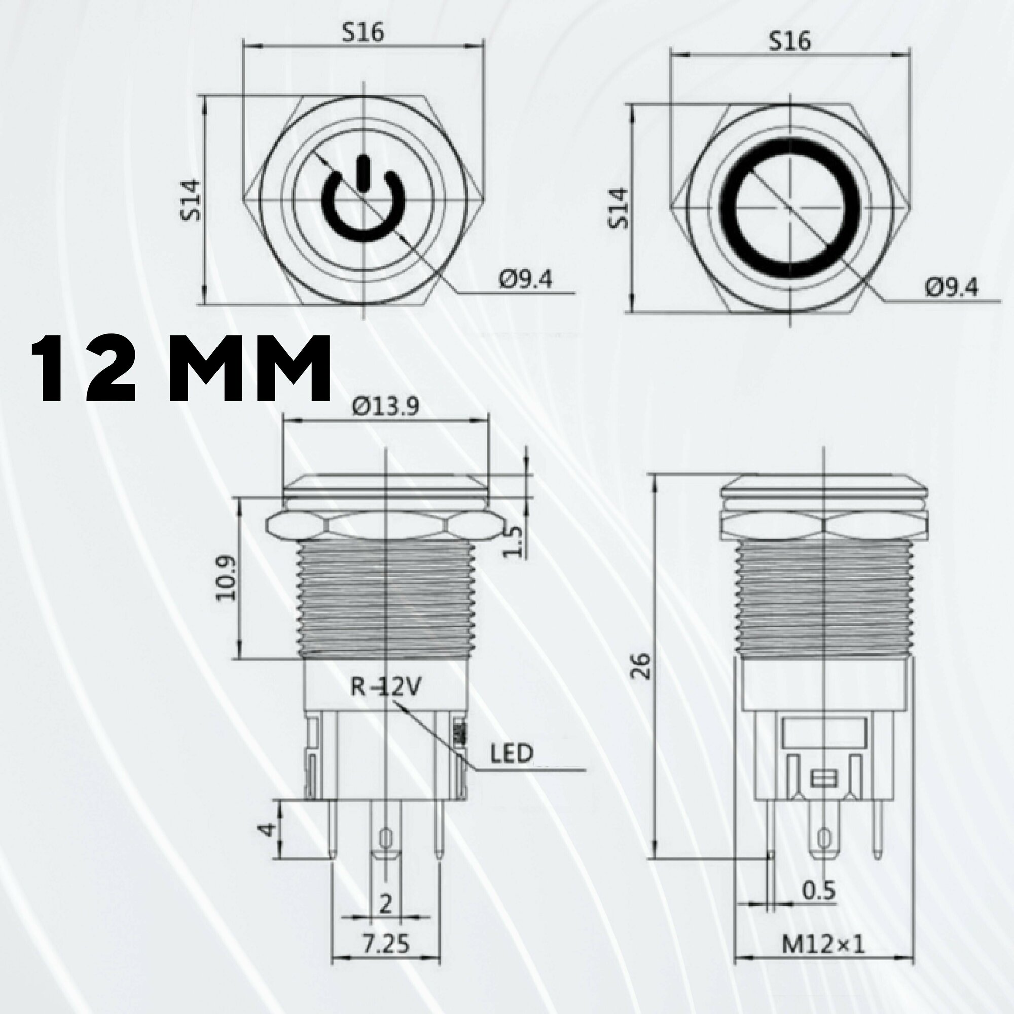 Кнопка встраиваемая в корпус металлическая с индикатором (12-24 В, 12 мм) / Зеленый / С фиксацией. Значок интересное: