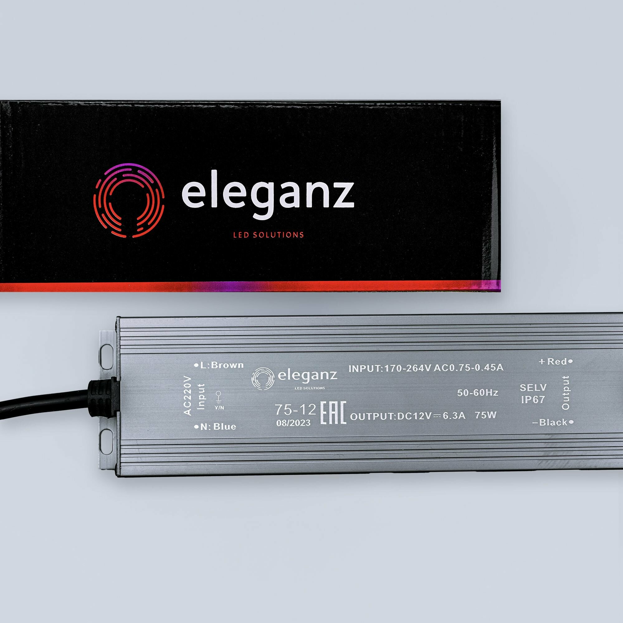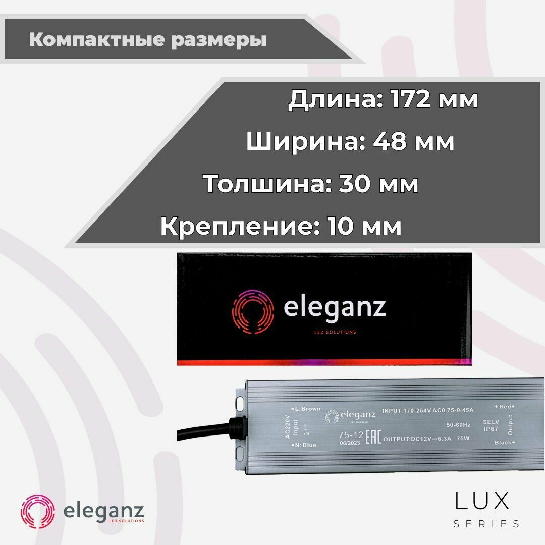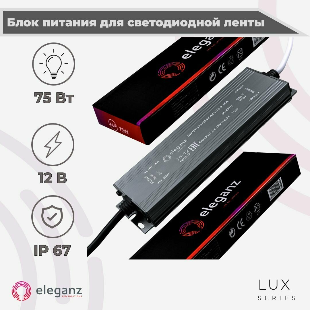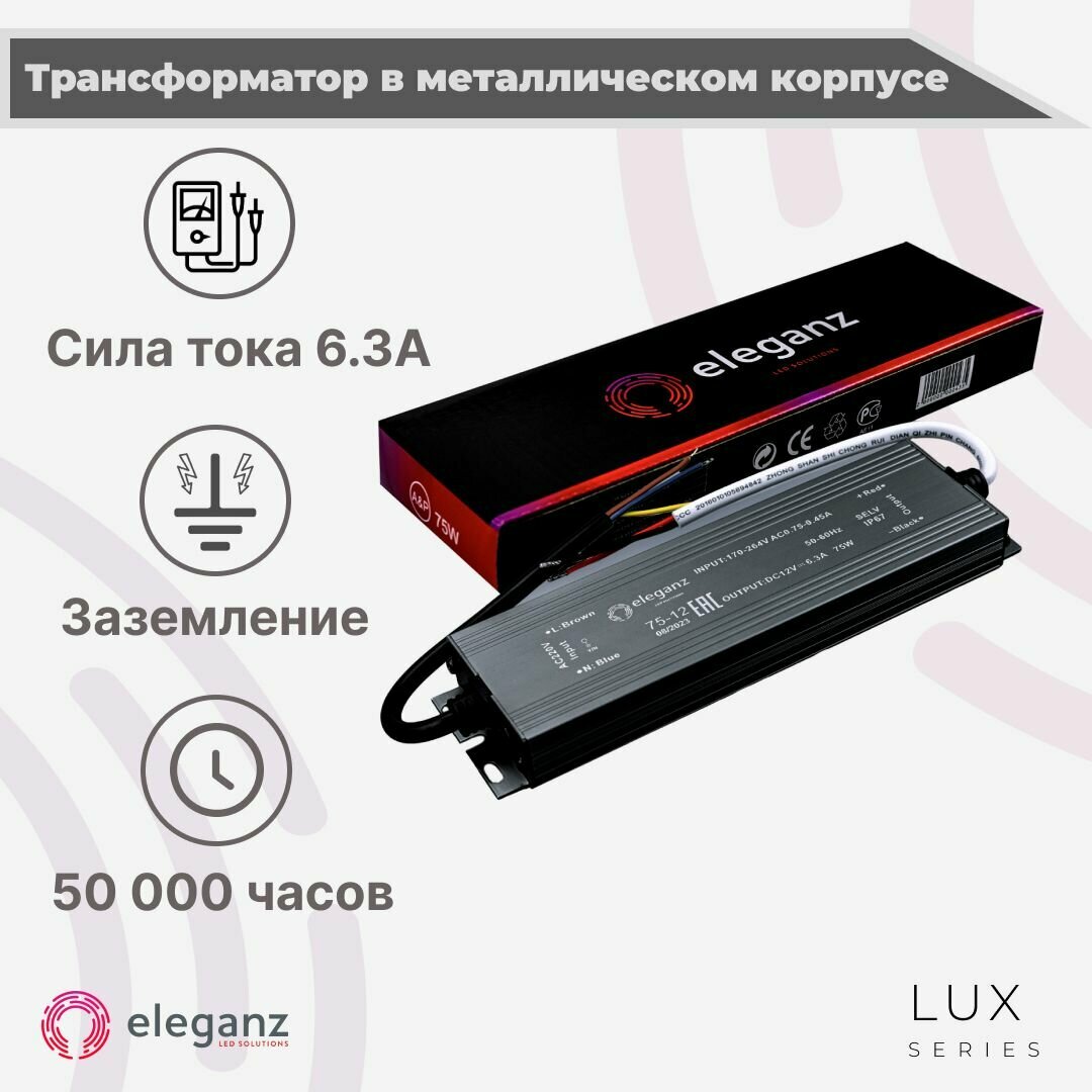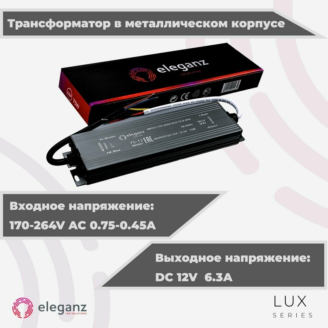 | Комплектация | Герметичный блок питания/трансформатор (металлический корпус) "Eleganz 75Вт" для светодиодной ленты 12В IP67 |