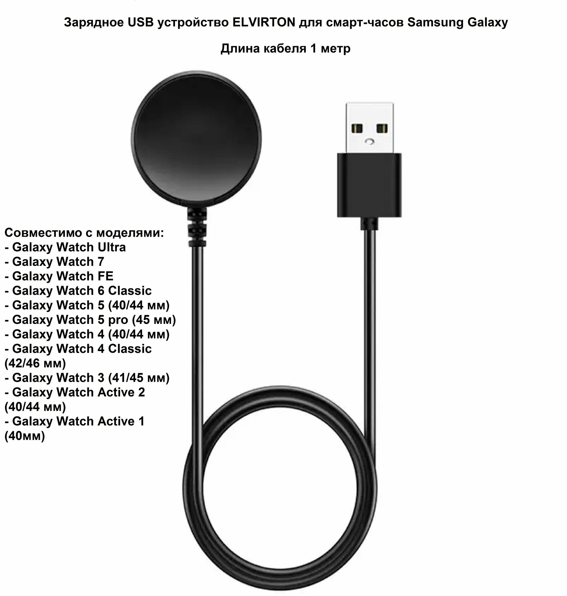 Зарядное магнитное USB устройство ELVIRTON для смарт-часов Samsung Galaxy Watch / Active, 1 метр (чёрное) интересное: