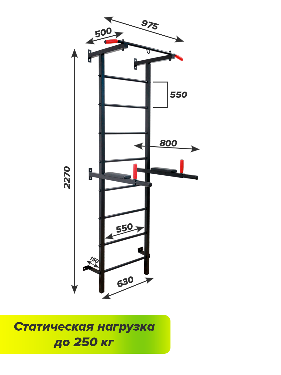 | Дополнительная информация | Вылет турника 500 мм, вылет брусьев 670 мм, ширина ступеней 500 мм, ширина турника 670 мм. |