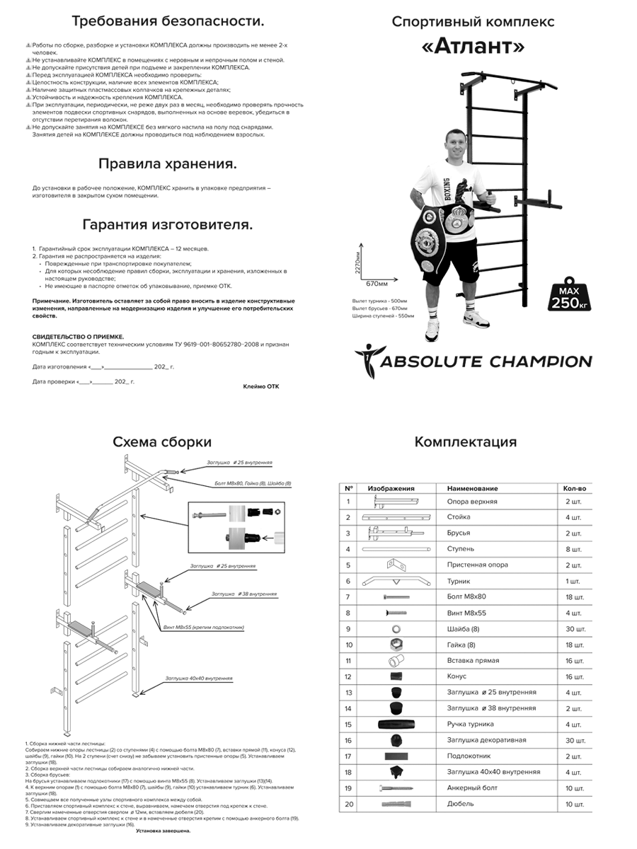 | Подробная комплектация | Опора верхняя-2шт, стойка-4шт, брусья-2шт, ступень-8шт, пристенная опора-2шт; турник-1шт, болт М8х80-18шт, винт М8х55-4шт, шайба 8-30шт, гайка 8-18шт; вставка прямая-16шт, конус-16шт, заглушка d25 внутренняя-4шт,; заглушка d38 внутренняя-2шт, ручка турника-4шт, заглушка декоративная-30шт; подлокотник-2шт, заглушка 40х40 внутренняя-4шт, анкерный болт-10шт, дюбель-10шт |