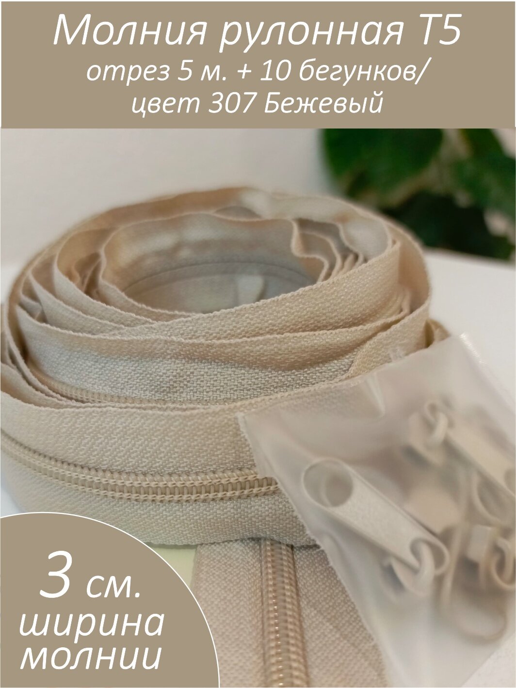 Молния рулонная спираль (витая) цвет латте тип 5 длина 5 м + бегунок 10шт