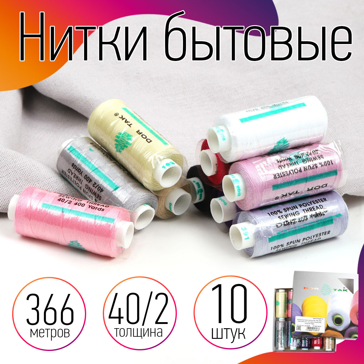 Ниже Вы можете прочитать отзывы на Набор бытовых ниток Dor Tak, толщина 40/2, 366м, 100% полиэстер, уп.10шт, №2 светлая база, ознакомится с подробными характеристиками, посмотреть интересные обзоры и фотографии на Набор бытовых ниток Dor Tak, толщина 40/2, 366м, 100% полиэстер, уп.10шт, №2 светлая база.