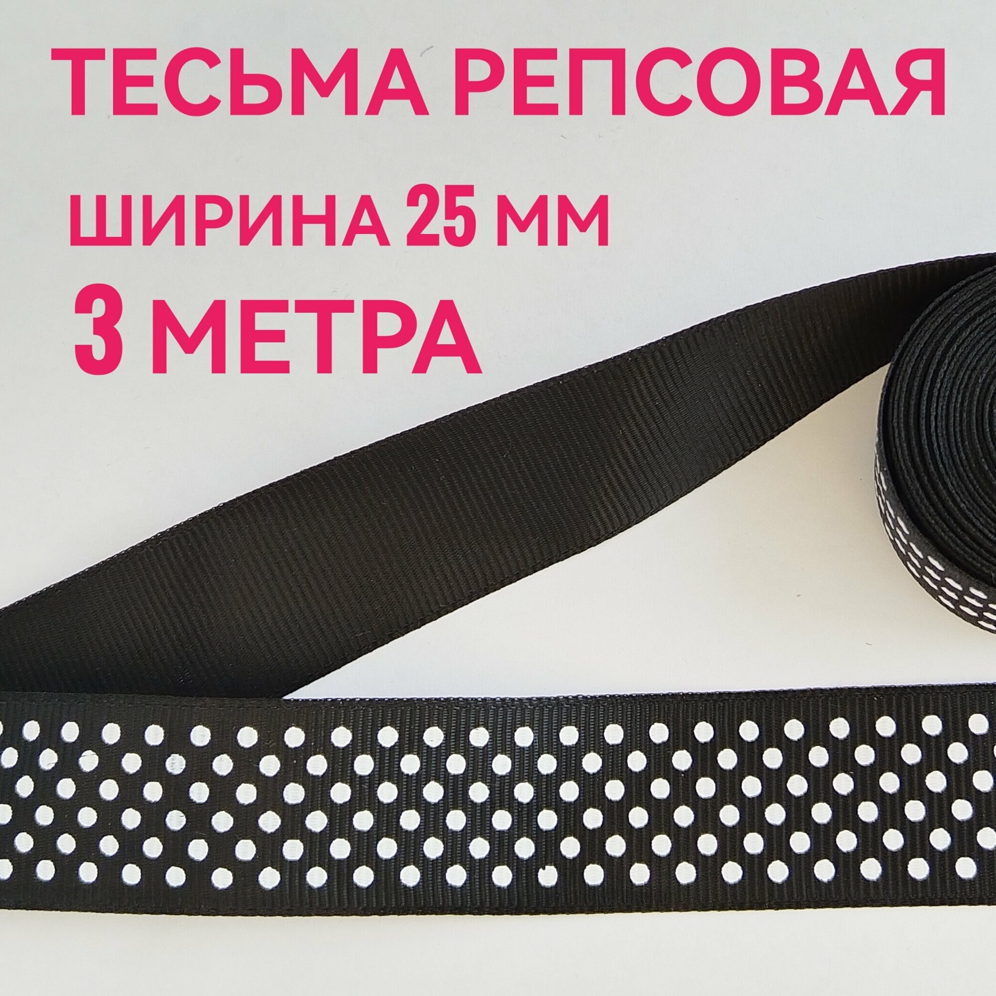 Лента/ тесьма репсовая для шитья черная в белый горох ш.25 мм, в уп.2 м, для шитья, творчества, рукоделия.