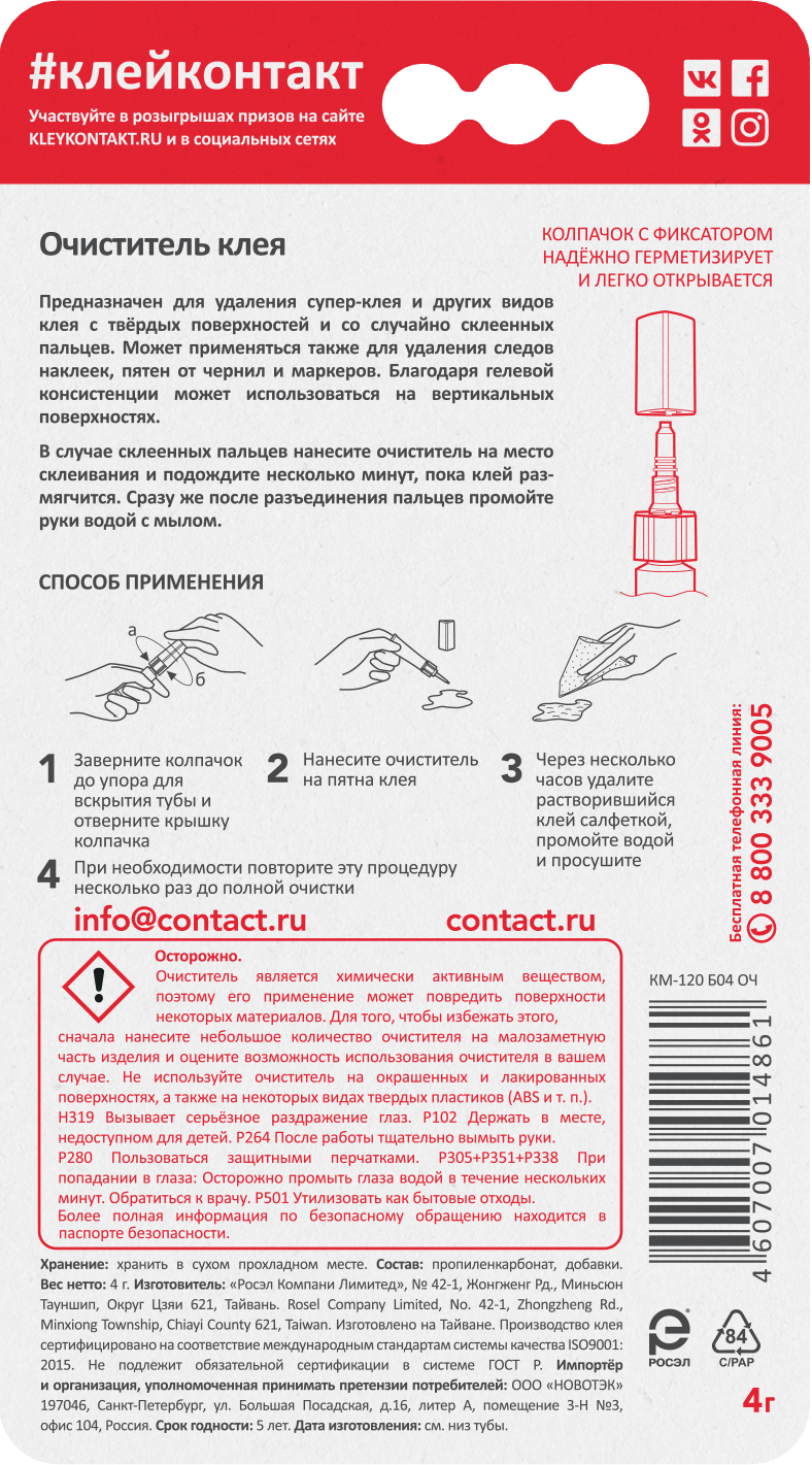 | Дополнительная информация | Очиститель клея Контакт Универсал гель 4 г |