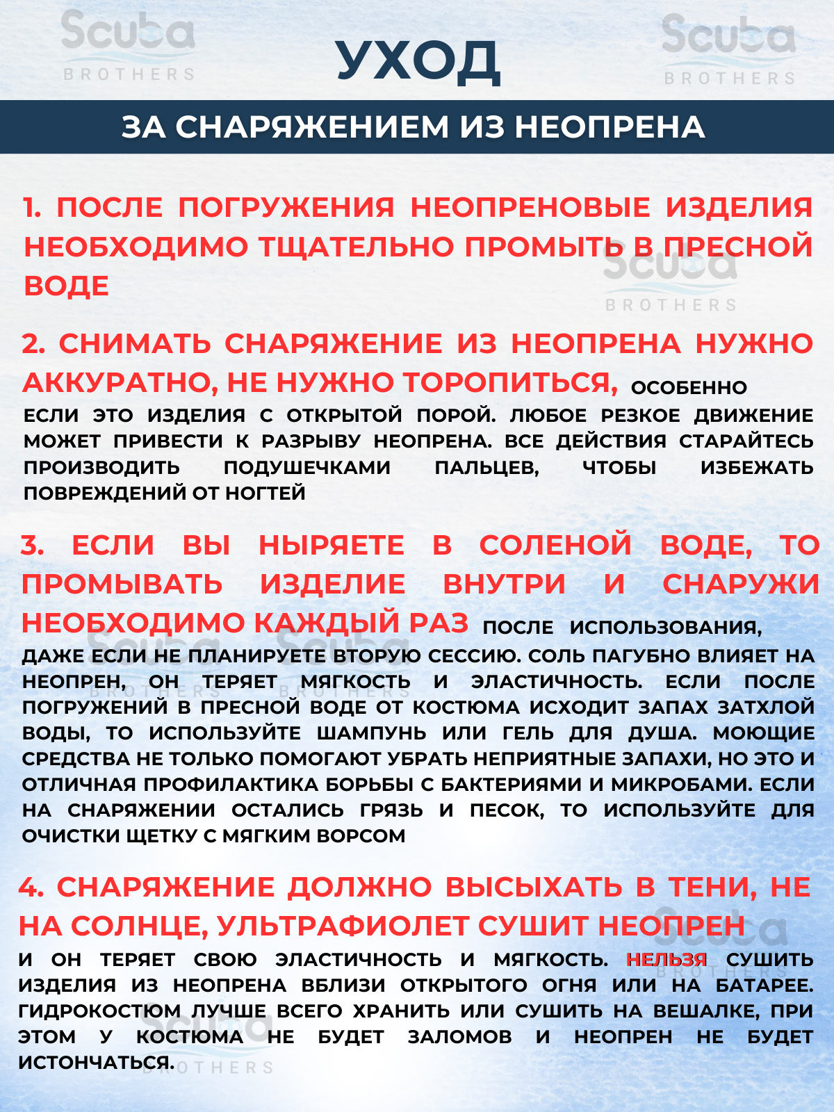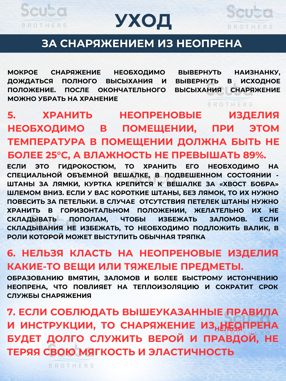 | Уход за вещами | Перед тем как начать сушить изделия из неопрена, его в обязательном порядке необходимо хорошо прополоскать в прохладной пресной воде. Начать процесс сушки рекомендуется с внутренней стороны. Обязательно сушите изделие в подвешенном состоянии, вдали от солнечных лучей и нагревательных приборов. |