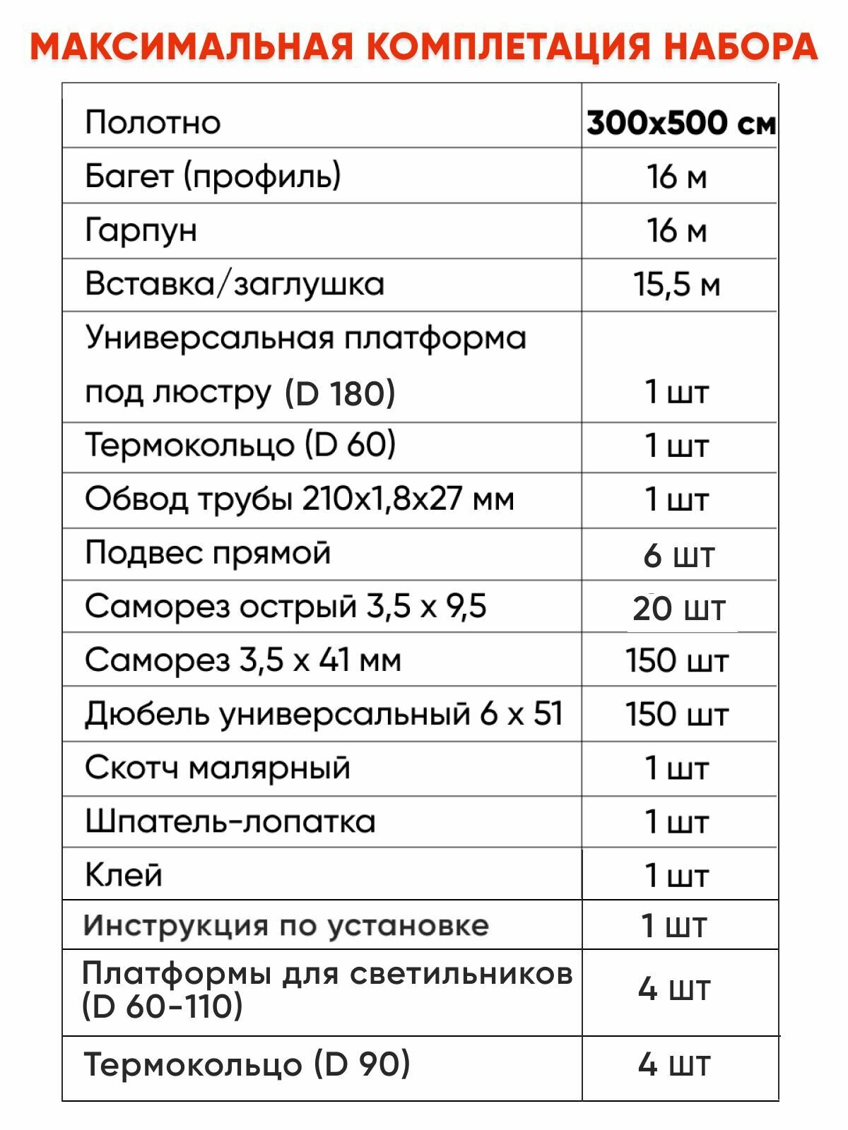 | Подробная комплектация | Полотно- 500x660 см. Багет (профиль) - 23 м. Гарпун - 23 м. Вставка/заглушка - 23 м. Универсальная платформа под люстру (D 180-250) – 1 шт. Термокольцо (D 60) – 1 шт. Обвод трубы 210x1,8 x 27 мм.- 1 шт. Подвес прямой – 2 шт. Саморез острый 3,5 x 9,5- 8 шт. Саморез 3,5 x 41 мм – 150 шт. Дюбель универсальный 6 x 51- 150 шт. Скотч малярный – 1 шт. Шпатель-лопатка – 1 шт. Клей – 1шт. |