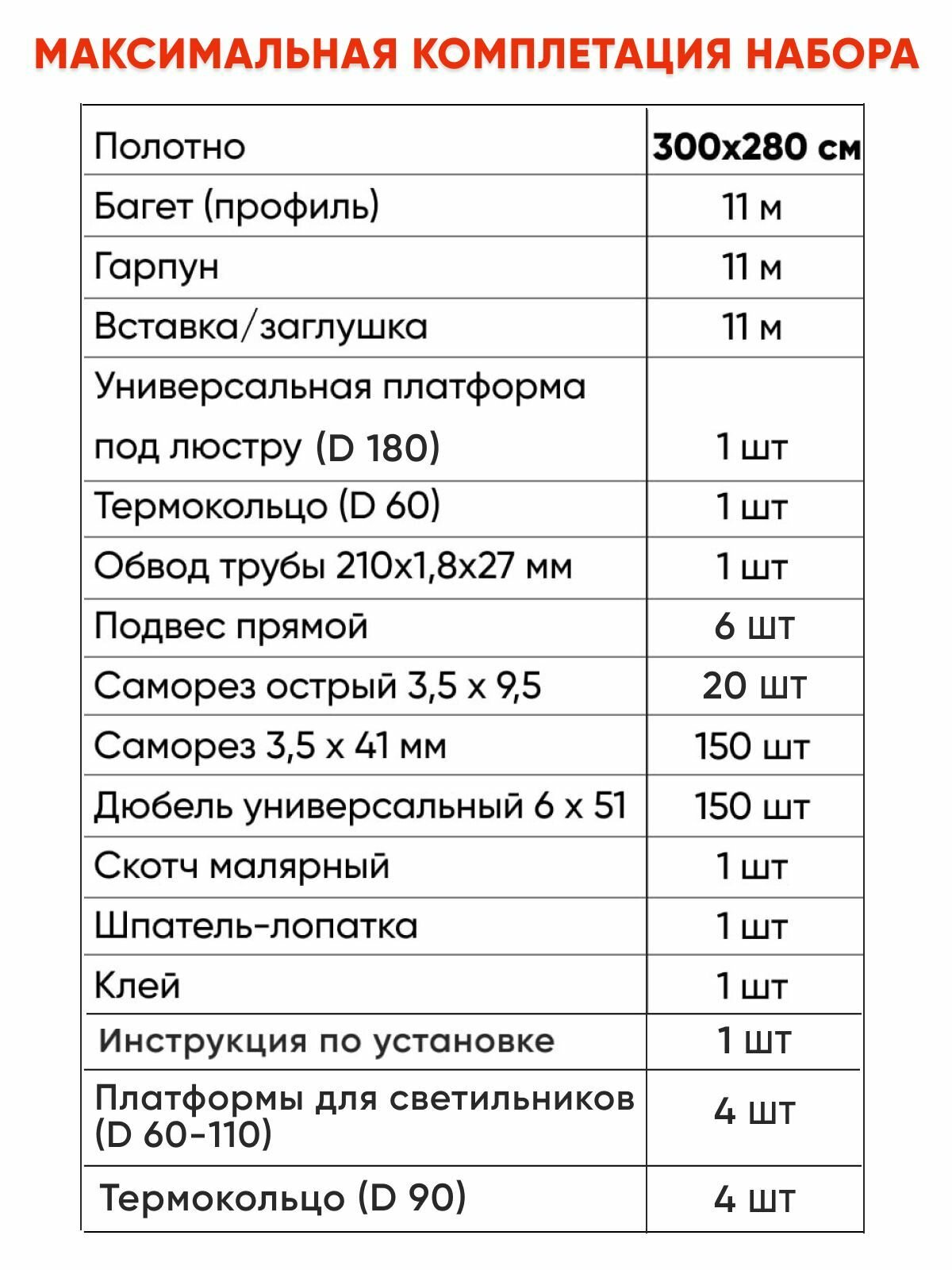 | Подробная комплектация | Полотно- 500x660 см. Багет (профиль) - 23 м. Гарпун - 23 м. Вставка/заглушка - 23 м. Универсальная платформа под люстру (D 180-250) – 1 шт. Термокольцо (D 60) – 1 шт. Обвод трубы 210x1,8 x 27 мм.- 1 шт. Подвес прямой – 2 шт. Саморез острый 3,5 x 9,5- 8 шт. Саморез 3,5 x 41 мм – 150 шт. Дюбель универсальный 6 x 51- 150 шт. Скотч малярный – 1 шт. Шпатель-лопатка – 1 шт. Клей – 1шт. |