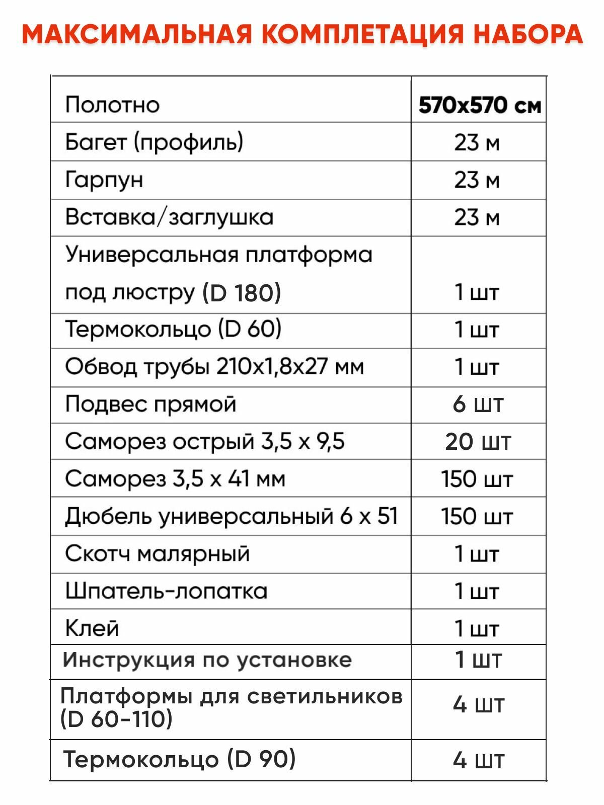 | Подробная комплектация | Полотно- 500x660 см. Багет (профиль) - 23 м. Гарпун - 23 м. Вставка/заглушка - 23 м. Универсальная платформа под люстру (D 180-250) – 1 шт. Термокольцо (D 60) – 1 шт. Обвод трубы 210x1,8 x 27 мм.- 1 шт. Подвес прямой – 2 шт. Саморез острый 3,5 x 9,5- 8 шт. Саморез 3,5 x 41 мм – 150 шт. Дюбель универсальный 6 x 51- 150 шт. Скотч малярный – 1 шт. Шпатель-лопатка – 1 шт. Клей – 1шт. |