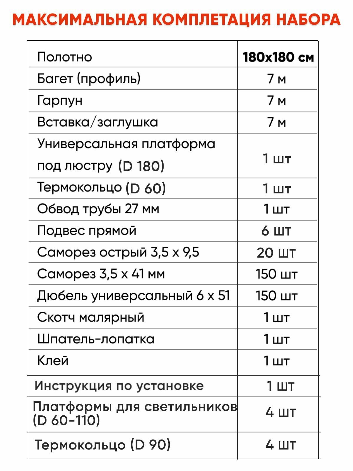 | Подробная комплектация | Полотно- 500x660 см. Багет (профиль) - 23 м. Гарпун - 23 м. Вставка/заглушка - 23 м. Универсальная платформа под люстру (D 180-250) – 1 шт. Термокольцо (D 60) – 1 шт. Обвод трубы 210x1,8 x 27 мм.- 1 шт. Подвес прямой – 2 шт. Саморез острый 3,5 x 9,5- 8 шт. Саморез 3,5 x 41 мм – 150 шт. Дюбель универсальный 6 x 51- 150 шт. Скотч малярный – 1 шт. Шпатель-лопатка – 1 шт. Клей – 1шт. |