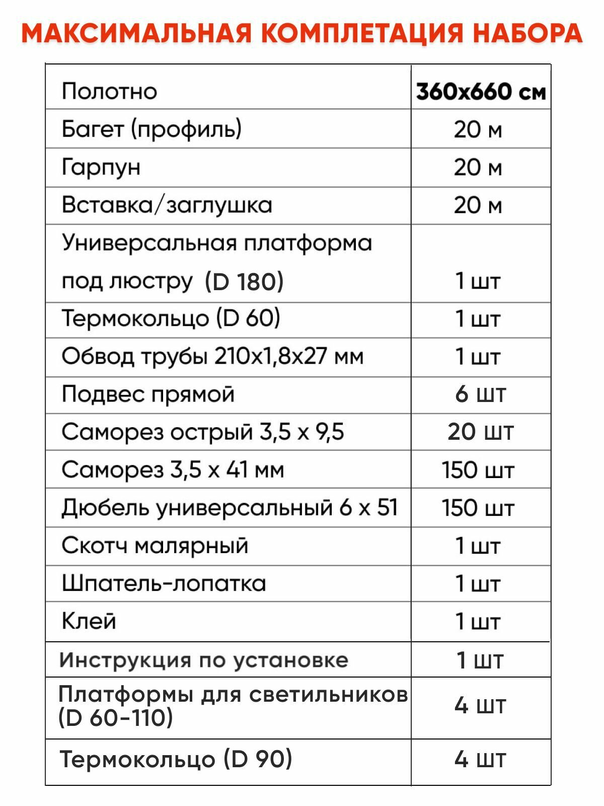 | Подробная комплектация | Полотно- 500x660 см. Багет (профиль) - 23 м. Гарпун - 23 м. Вставка/заглушка - 23 м. Универсальная платформа под люстру (D 180-250) – 1 шт. Термокольцо (D 60) – 1 шт. Обвод трубы 210x1,8 x 27 мм.- 1 шт. Подвес прямой – 2 шт. Саморез острый 3,5 x 9,5- 8 шт. Саморез 3,5 x 41 мм – 150 шт. Дюбель универсальный 6 x 51- 150 шт. Скотч малярный – 1 шт. Шпатель-лопатка – 1 шт. Клей – 1шт. |