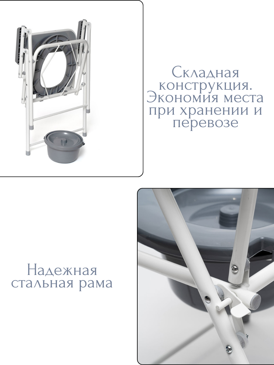 | Особенности | использование в качестве стула / откидываемая крышка / противоскользящие наконечники ножек / противоскользящие подлокотники / регулировка высоты сиденья / съемное санитарное оснащение |