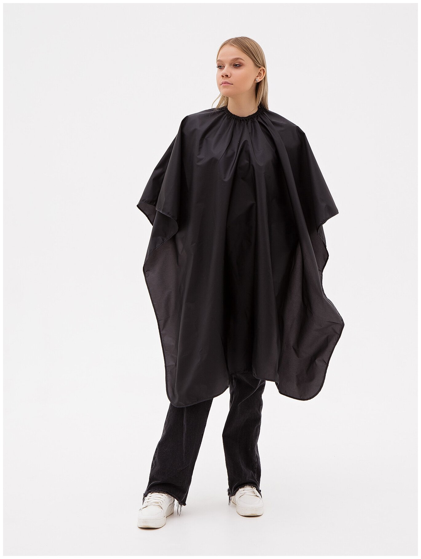 | Дополнительная информация | Накидывается на плечи модели, Крепится вокруг шеи с помощью крючков, Крючки крепятся за резинки (см фото и видео) Для достижения максимальных антистатических свойств материала, рекомендуется перед первой стиркой замочить пеньюар в кондиционере для белья |