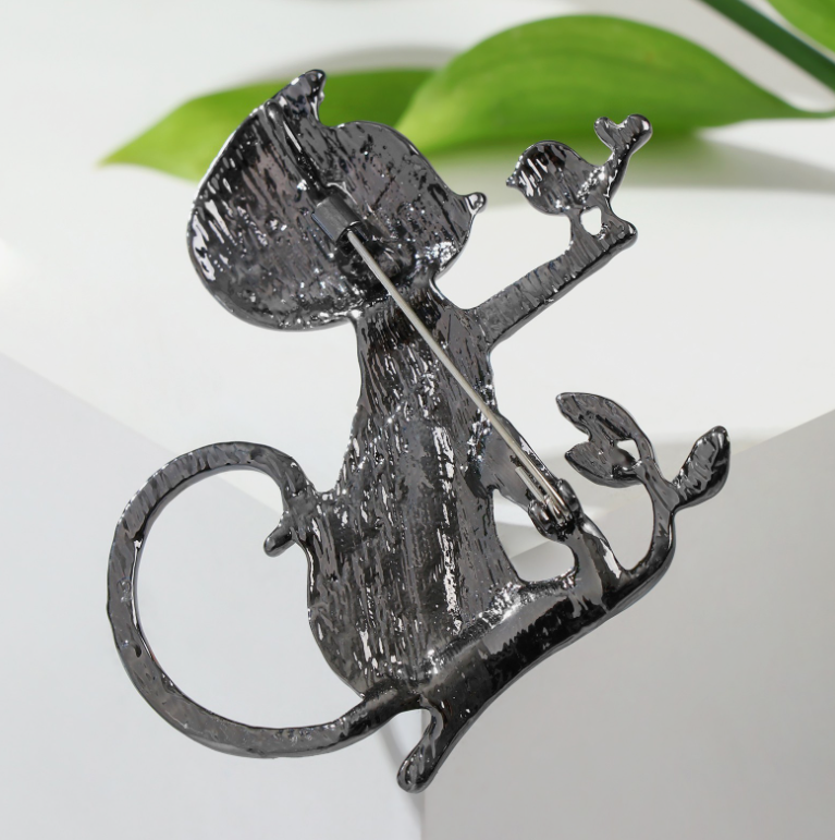 Брошь мультяшная "Кошка" с птичкой, цвет зелёный в сером металле интересное: