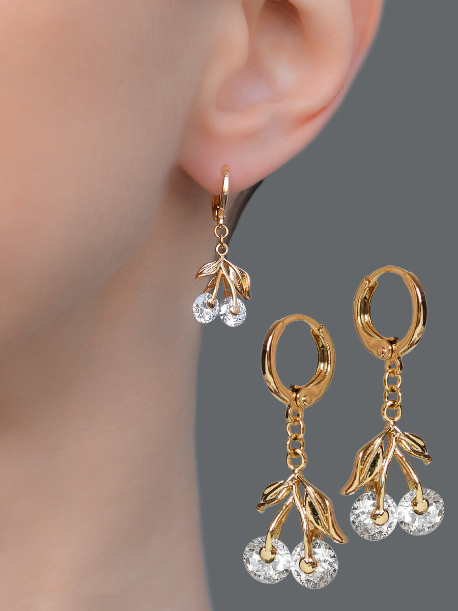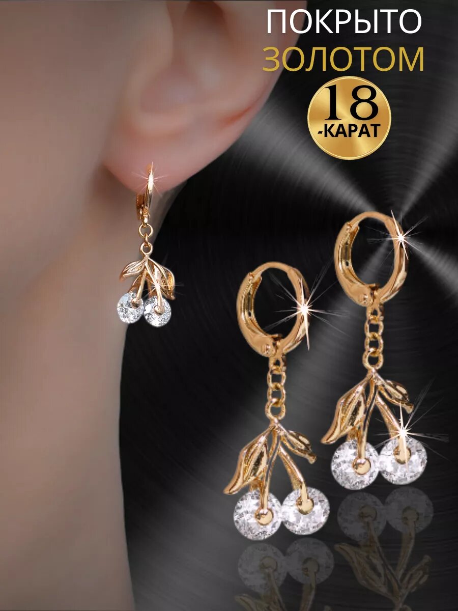 Серьги бижутерия длинные с подвеской вишенка, как серьги золотые 585 с замком конго, позолоченные с камнями из медицинского сплава, ювелирный, родирование