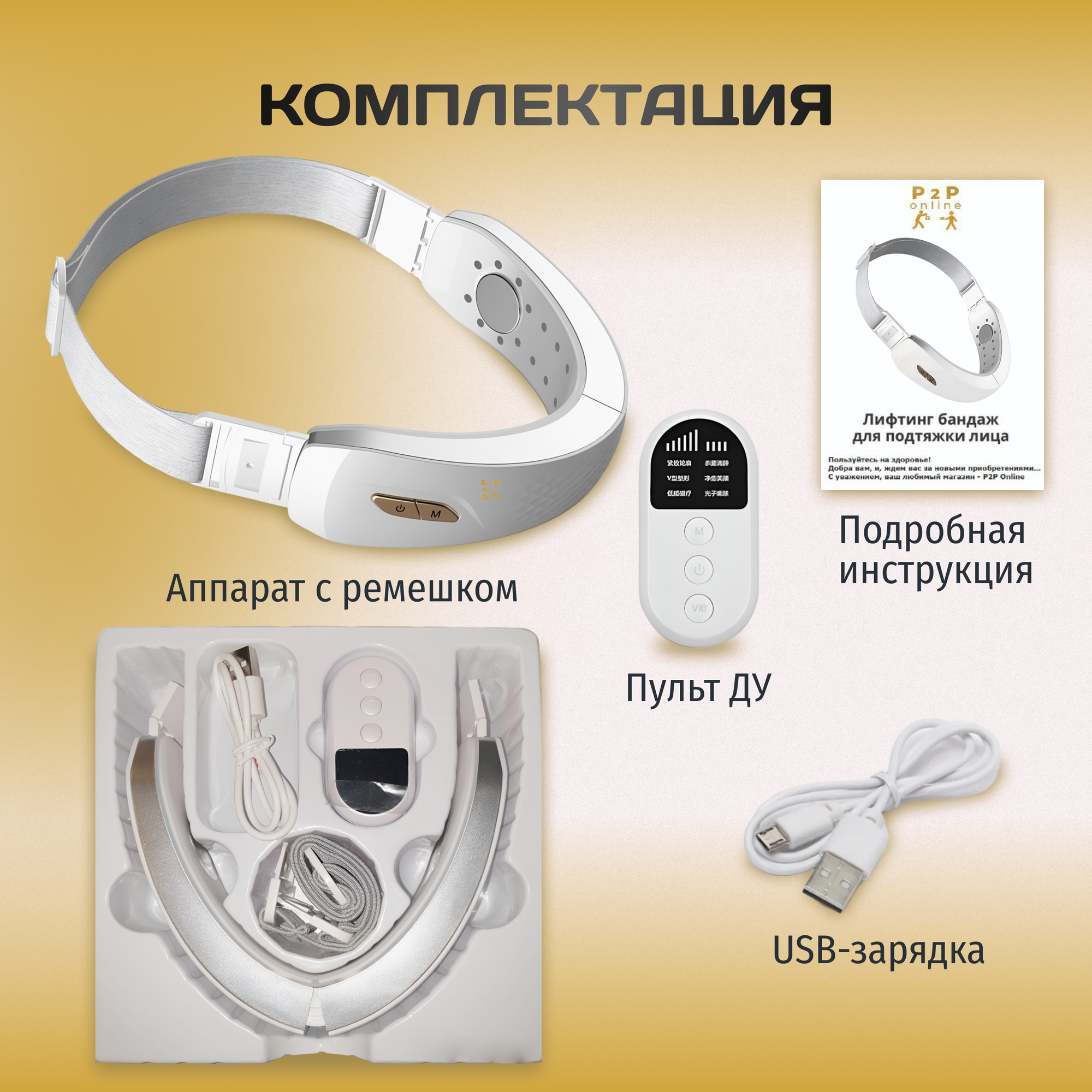 | Подробная комплектация | Бандаж, Ремень, USB кабель, Пульт ДУ, Гелевые накладки, Инструкция (русский) |