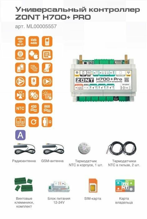 | Подробная комплектация | Контроллер ZONT H700+ PRO 1шт. Блокосновногопитания1шт. Антенна(для диапазона GSM и диапазона 433 МГц) 2шт. Датчик температуры МЛ-773(NTC) 1шт. Датчик температуры проводной в гильзе (NTC) 2шт. SIM-карта 1шт. Регистрационная пластиковая карта 1шт. Винтовые клеммники , комплект 1шт. Паспорт изделия 1шт. |