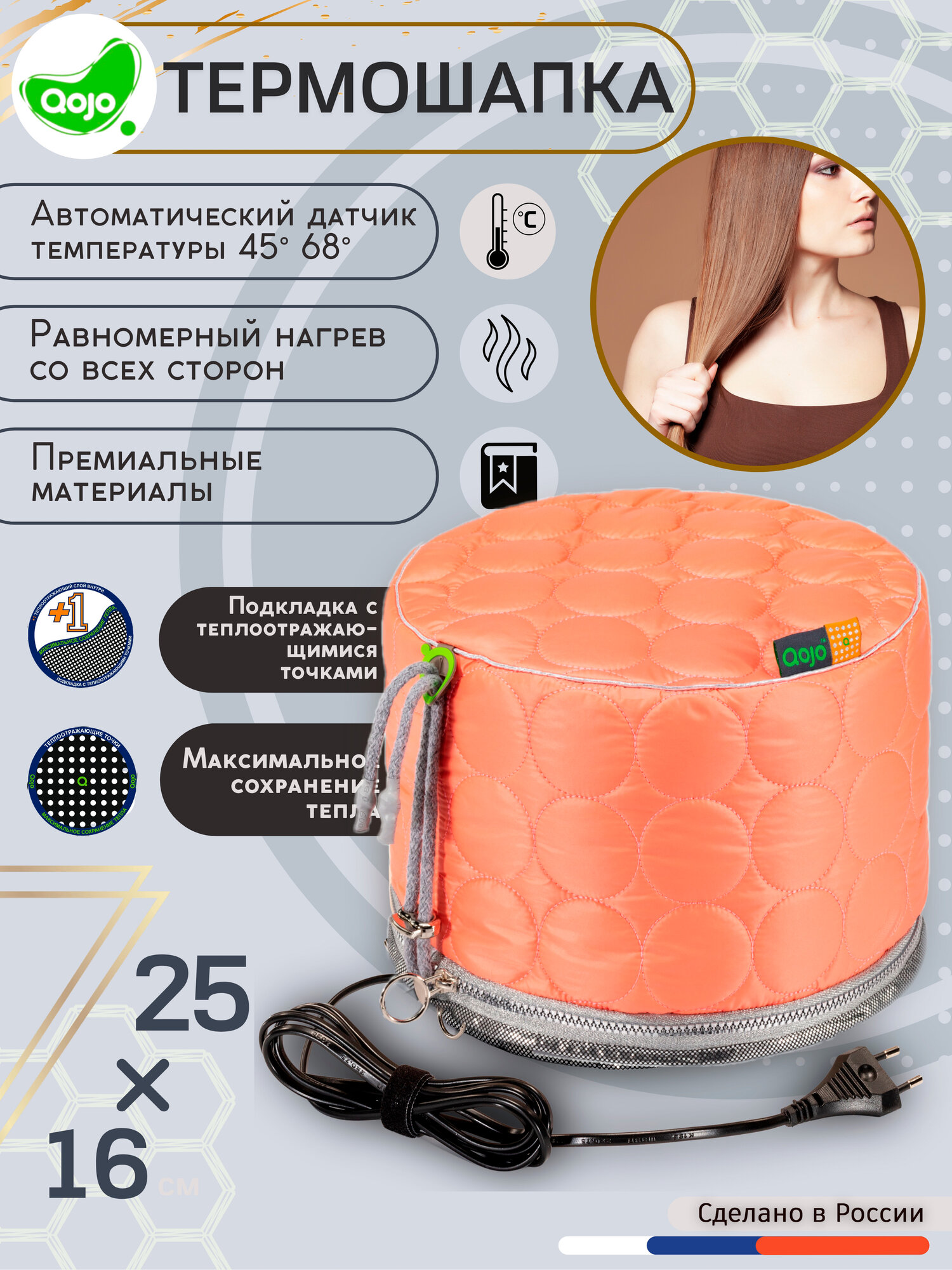 | Подробная комплектация | Термошапка для волос электрическая Qojo Sirius Plus One 25x16 см с теплоотражающим слоем в картонной коробке - 1шт. |