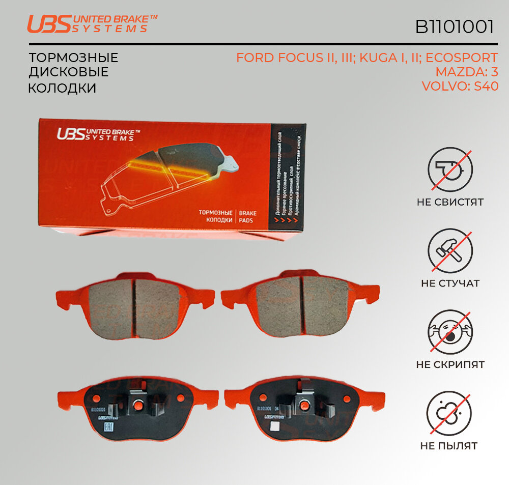 UBS B1101001 Тормозные колодки FORD FOCUS II 04/III 11/KUGA I 08/II 13/ECOSPORT 14/MAZDA 3 03/09/ передние компл. 4 шт. интересное: