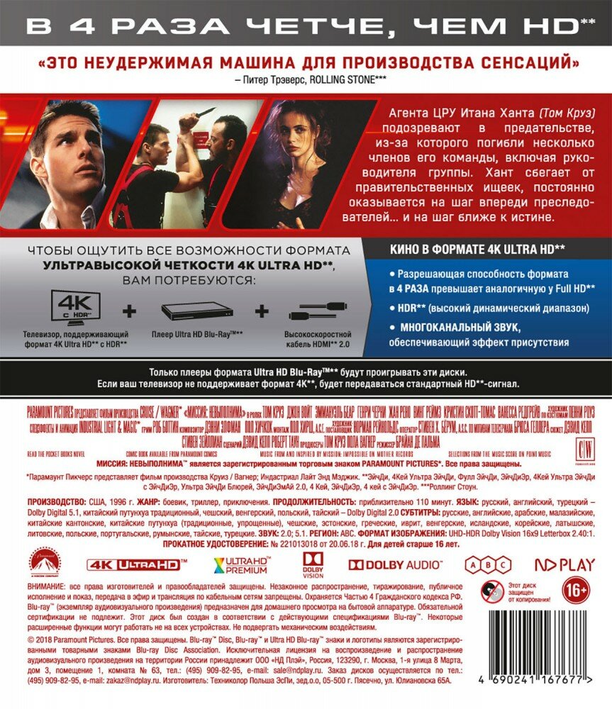 Миссия Невыполнима (Blu-Ray 4K Ultra HD) (1996 год, блю-рей диск, невероятно высокая четкость, Blu-Ray Box + картон) интересное: