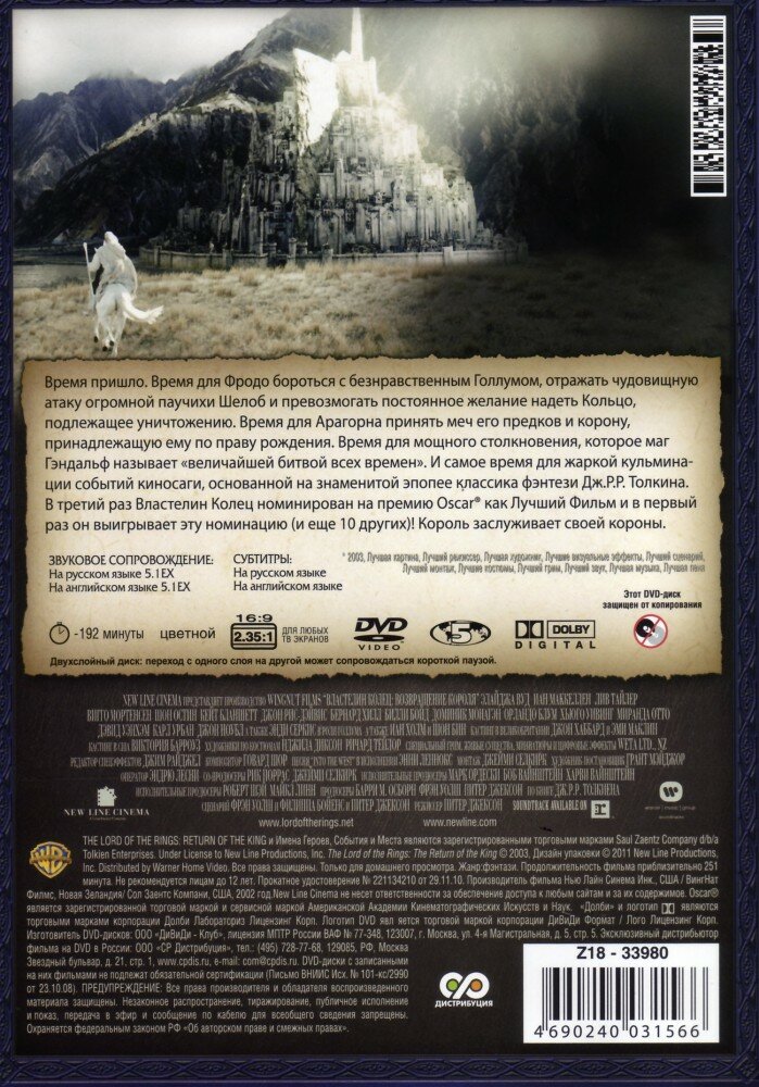 Властелин Колец: Коллекция (3 DVD) (2001 год, ДВД диск, DVD Box) интересное:
