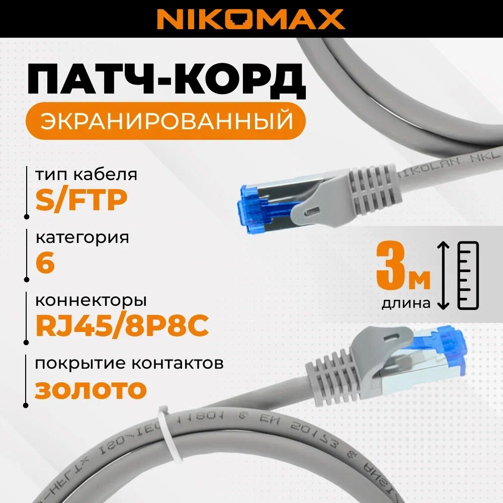 Коммутационный шнур NIKOMAX Essential Line S/FTP 4 пары, Кат.6 (Класс E), 250МГц, 2хRJ45/8P8C, T568B, заливной, с защитой защелки, многожильный, BC (чистая медь), 26AWG (7x0,150мм), LSZH нг(А)-HFLTx, светло-серый, 3м интересное: