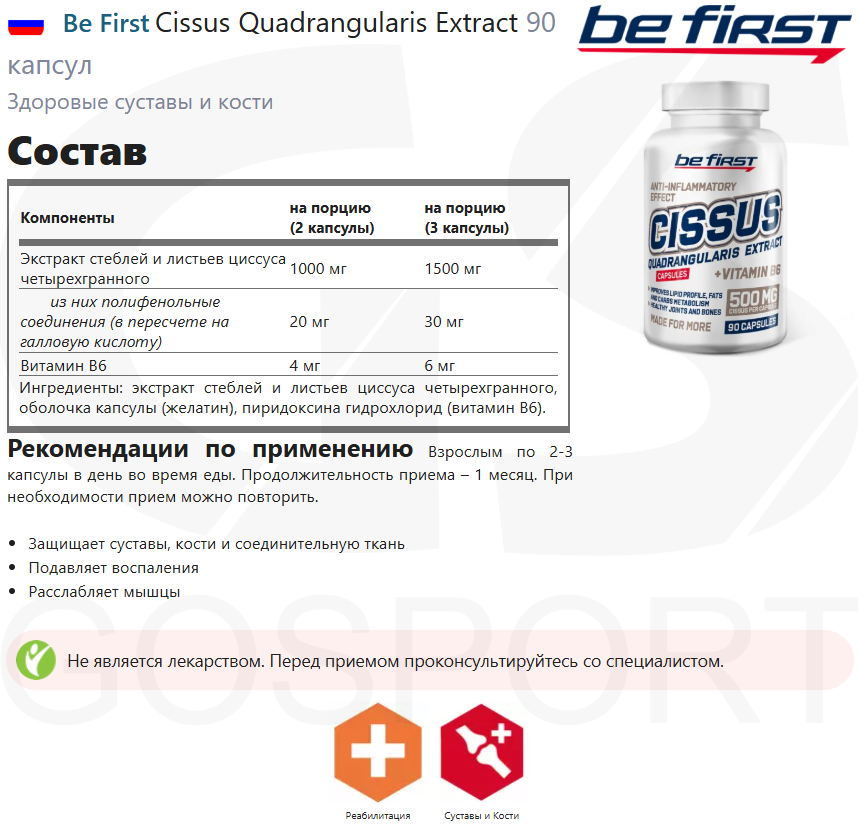 Ниже Вы можете прочитать отзывы на Комплекс хондропротекторов Be First Cissus Quadrangularis Extract 90 капсул, ознакомится с подробными характеристиками, посмотреть интересные обзоры и фотографии на Комплекс хондропротекторов Be First Cissus Quadrangularis Extract 90 капсул.